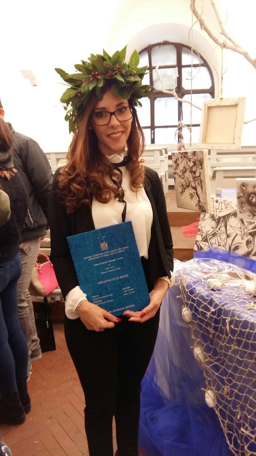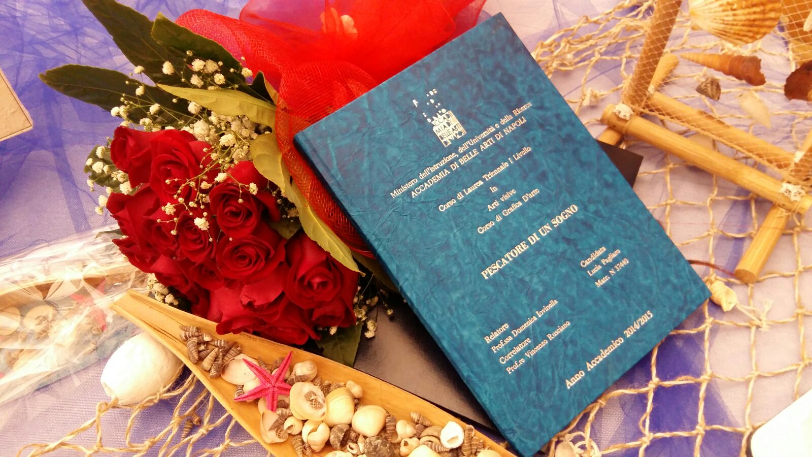 Qui, lo studio è stato premiato dalle soddisfazioni dei voti e degli apprezzamenti di docenti e colleghi di studio. Ed ancora, dopo una intensa applicazione nello studio e nella ricerca, nell’Anno Accademico 2014/2015, la dott.ssa Lucia ha coronato il suo sogno che è diventato realtà. Infatti, venerdì 23 ottobre 2015, ha conseguito la Laurea Triennale di I Livello in “Arti Visive e Progettuali” – “Corso di Grafica D’Arte” con la valutazione massima di 110 e Lode. Il titolo della tesi: “Pescatore di un Sogno” ha avuto come Relatore la Prof. Domenica Iovinella e Correlatore il Prof. Vincenzo Rusciano.