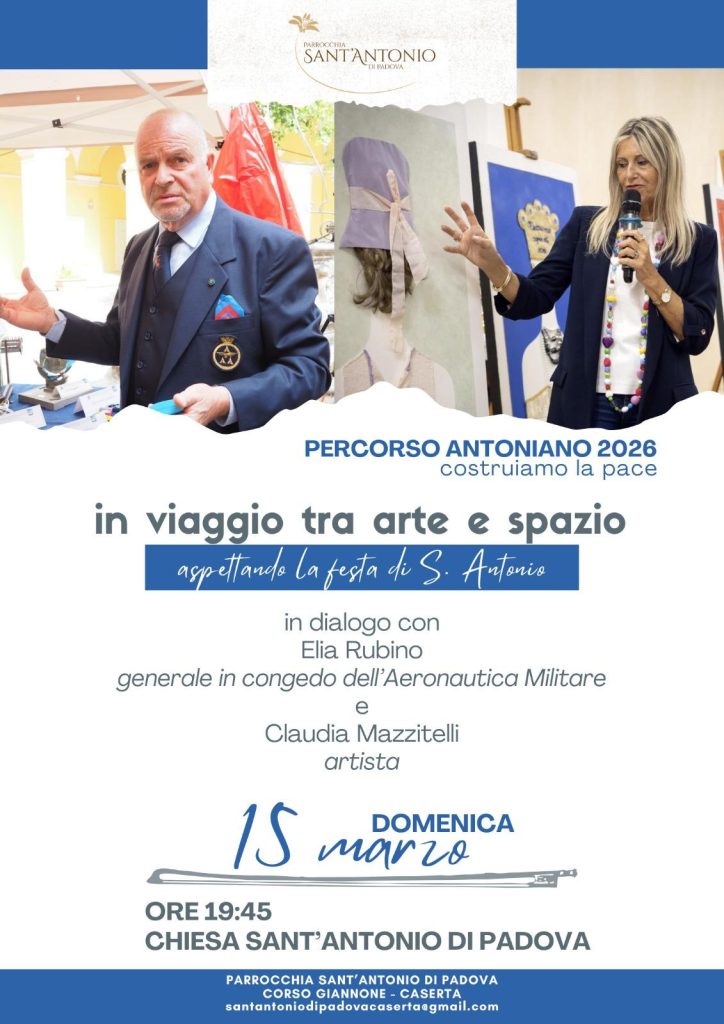 CASERTA – Aspettando la festa di Sant’Antonio, atto terzo. Domenica 15 marzo la Parrocchia dedicata al Santo di Padova ospita i Sant’Antonio di Padova sarà teatro dell’evento culturale “In viaggio nello spazio tra arte e scienza”. Si tratta di un incontro pensato per avvicinare il pubblico alle meraviglie dell’universo attraverso due prospettive complementari: quella artistica e quella scientifica.