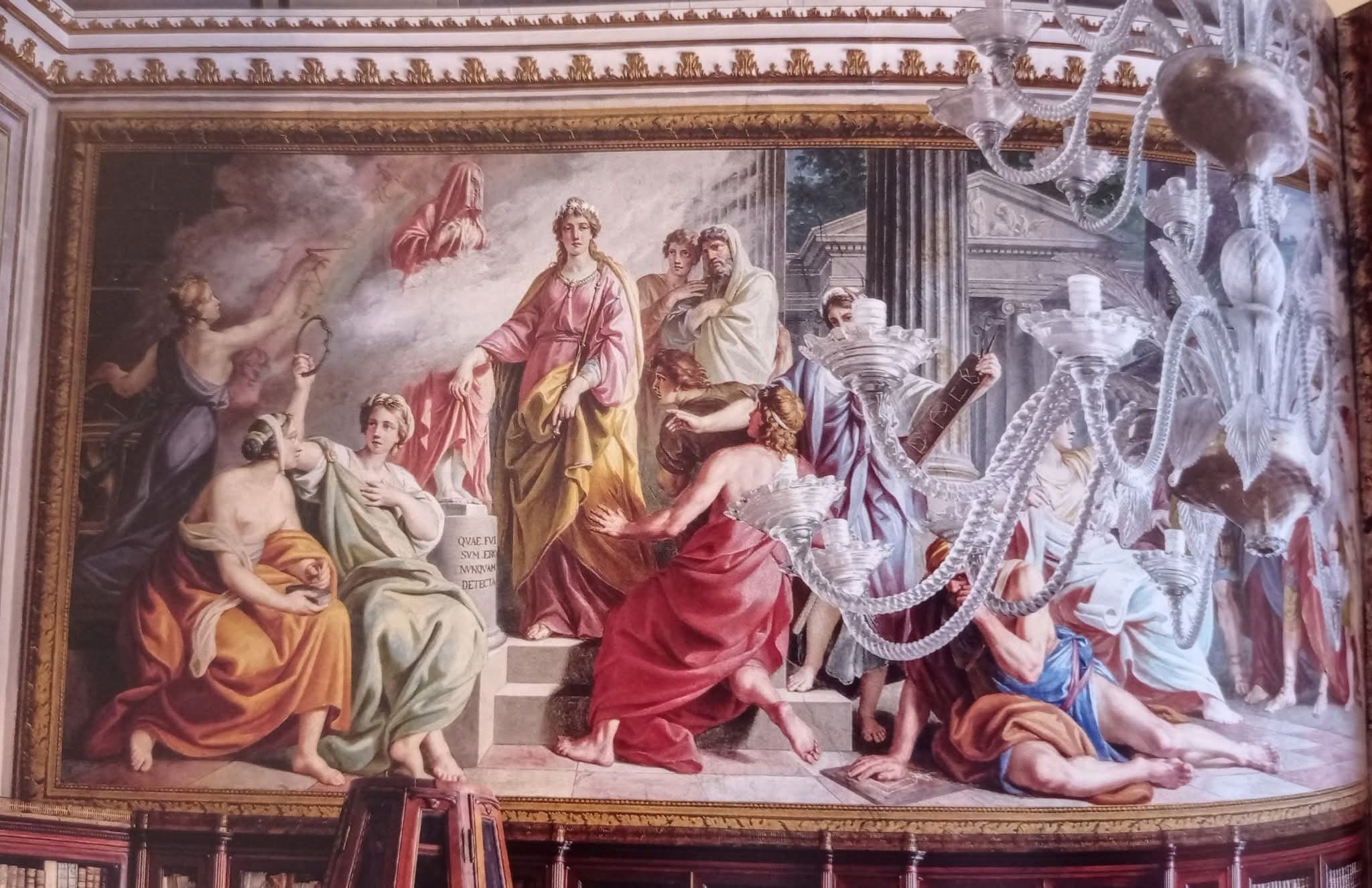 Maratta studia alla bottega di Andrea Sacchi, uno dei maggiori artisti del Seicento, e predilige la linea classicista rispetto al barocco fantasioso e scenografico di Andrea Pozzo, autore del celebre soffitto di Sant’Ignazio a Roma. Di questi rimandi a Sacchi si era accorta anche la giovane e brava Alessia dello Stritto, che con me svolse tirocinio proprio sulla detta Biblioteca ai tempi della direzione di Mauro Felicori, quindi mi ero ripromessa di tornare sull’argomento per approfondire.