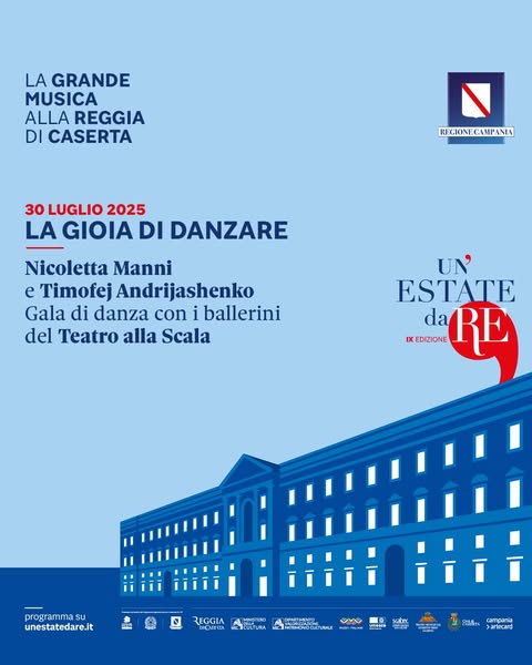 CASERTA – La danza è arte, tecnica, poesia. Ma soprattutto, per Nicoletta Manni e Timofej Andrijashenko, ballerini del Teatro della Scala, è gioia. Ed è proprio questa emozione profonda a ispirare “La Gioia di Danzare”, spettacolo prodotto da ARTEDANZAsrl, ideato e diretto dalla coppia più luminosa del balletto italiano – Étoile e Primo Ballerino del Teatro alla Scala – che il 30 luglio andrà in scena in una tra le più suggestive location open-air d’Italia: la Reggia di Caserta.