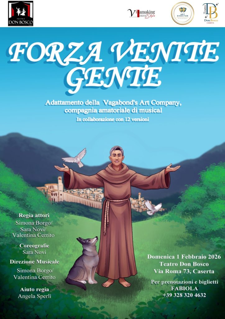 Forza Venite Gente” racconta la vita di San Francesco d’Assisi, focalizzandosi sulla sua conversione, l’amore per la natura e il conflitto generazionale con il padre Pietro Bernardone commerciante materialista in contrasto con il Santo che decide di abbandonare le ricchezze per seguire ideali trascendenti. Francesco si spoglia degli abiti borghesi davanti al padre e alla comunità per indossare il saio, dedicandosi alla vita povera. La rappresentazione include la figura di Santa Chiara, la “Cenciosa” (personaggio simbolico) e la Povertà, presentata come compagna di vita. Il musical narra la predica agli uccelli, il rapporto con il lupo di Gubbio e il riconoscimento del Papa, culminando con la morte di Francesco e il lutto del lupo. che decide di abbandonare le ricchezze per seguire ideali trascendenti.
